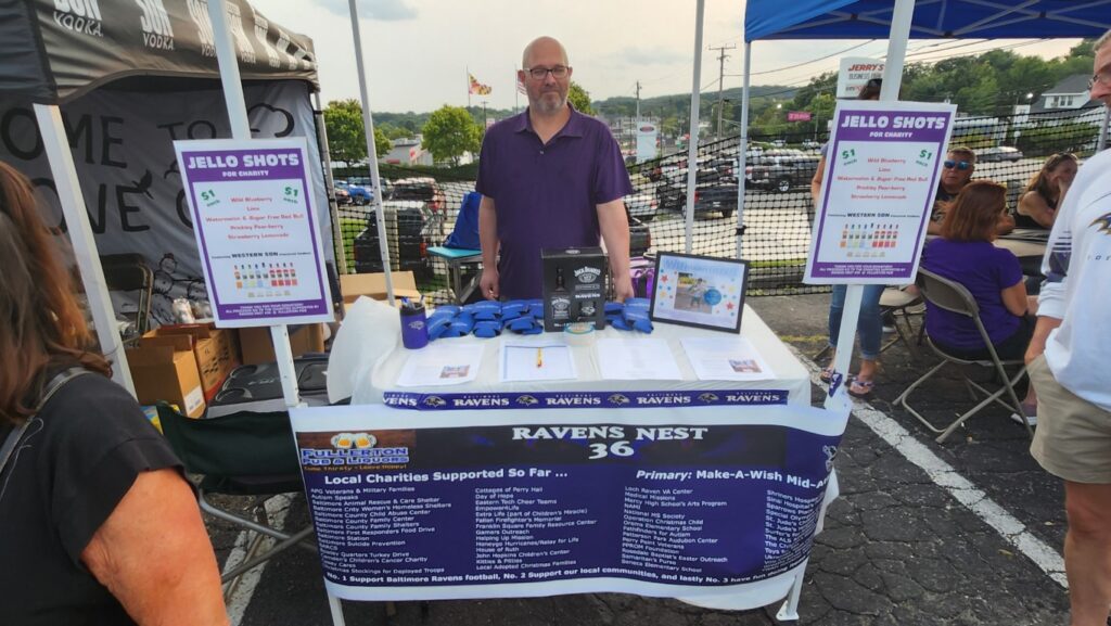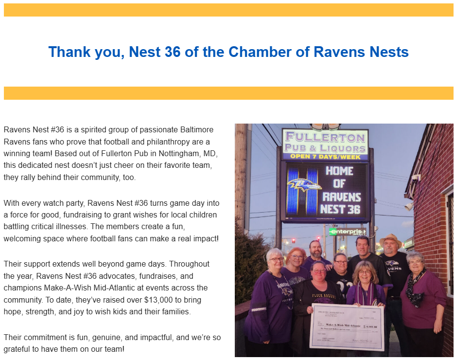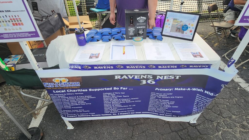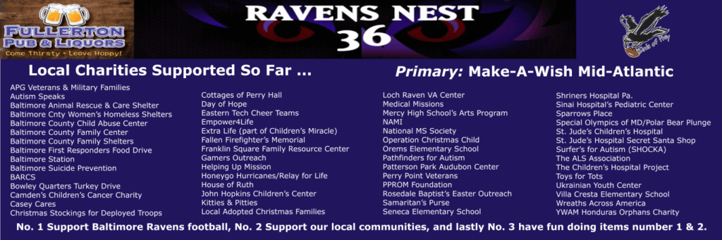 Make-A-Wish Mid-Atlantic joined Nest 36 for another Ravens game to talk about the work they do granting wishes in the Baltimore area. Nest 36 and Fullerton Pub presented a check for $6,000 and officially met their goal of raising enough money to support 1 full wish ($12,000 to date) in the Mid-Atlantic region for their charity.